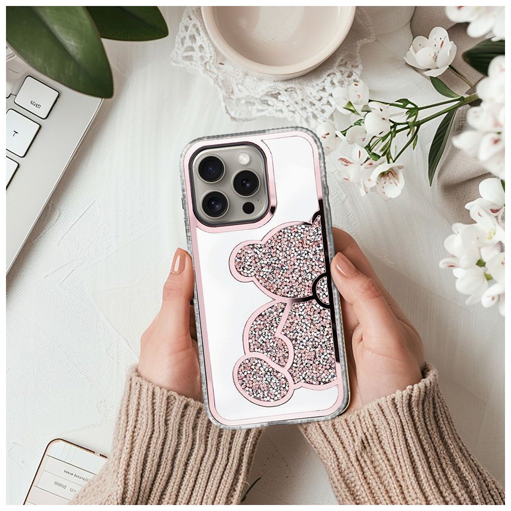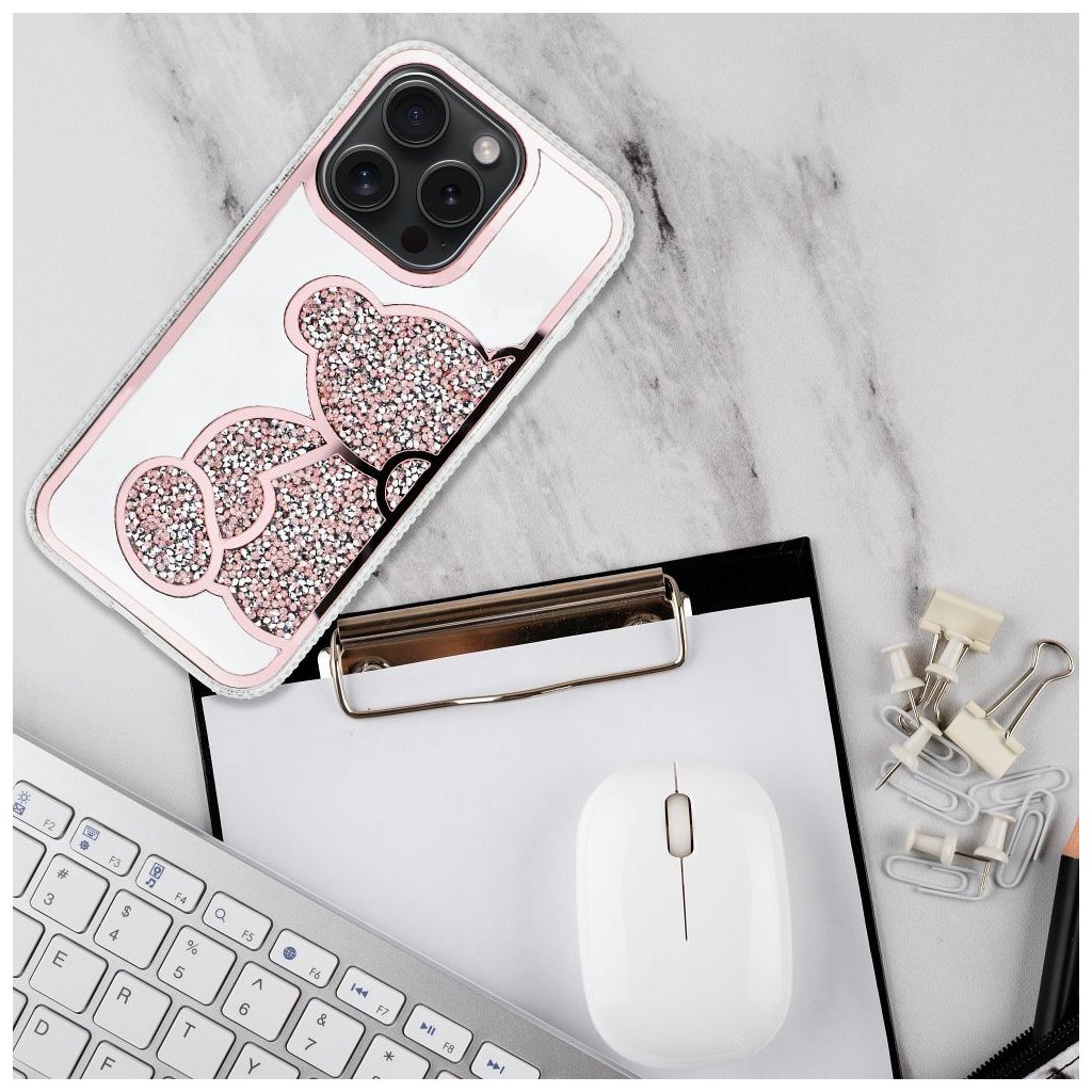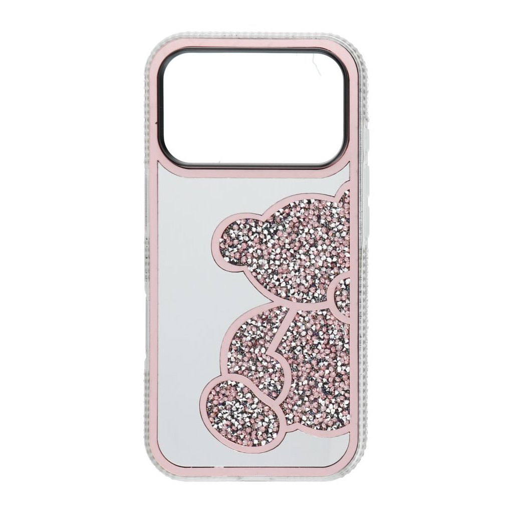 Elegantný kryt na mobil TEDDY BEAR pre IPHONE 17 Pro ružový ktorý sa vyznačuje charakteristickým trblietavým vzorom medvedíka, vyvýšenými okrajmi a plastom.