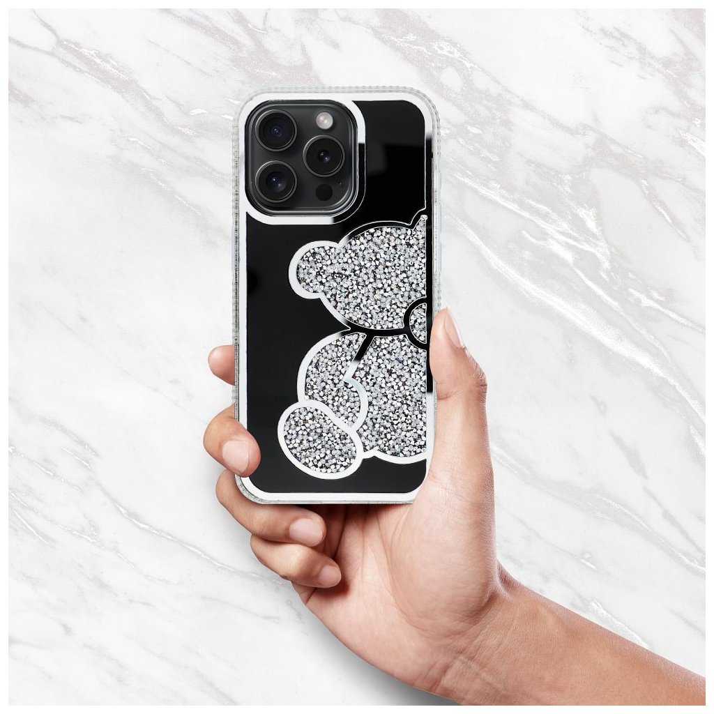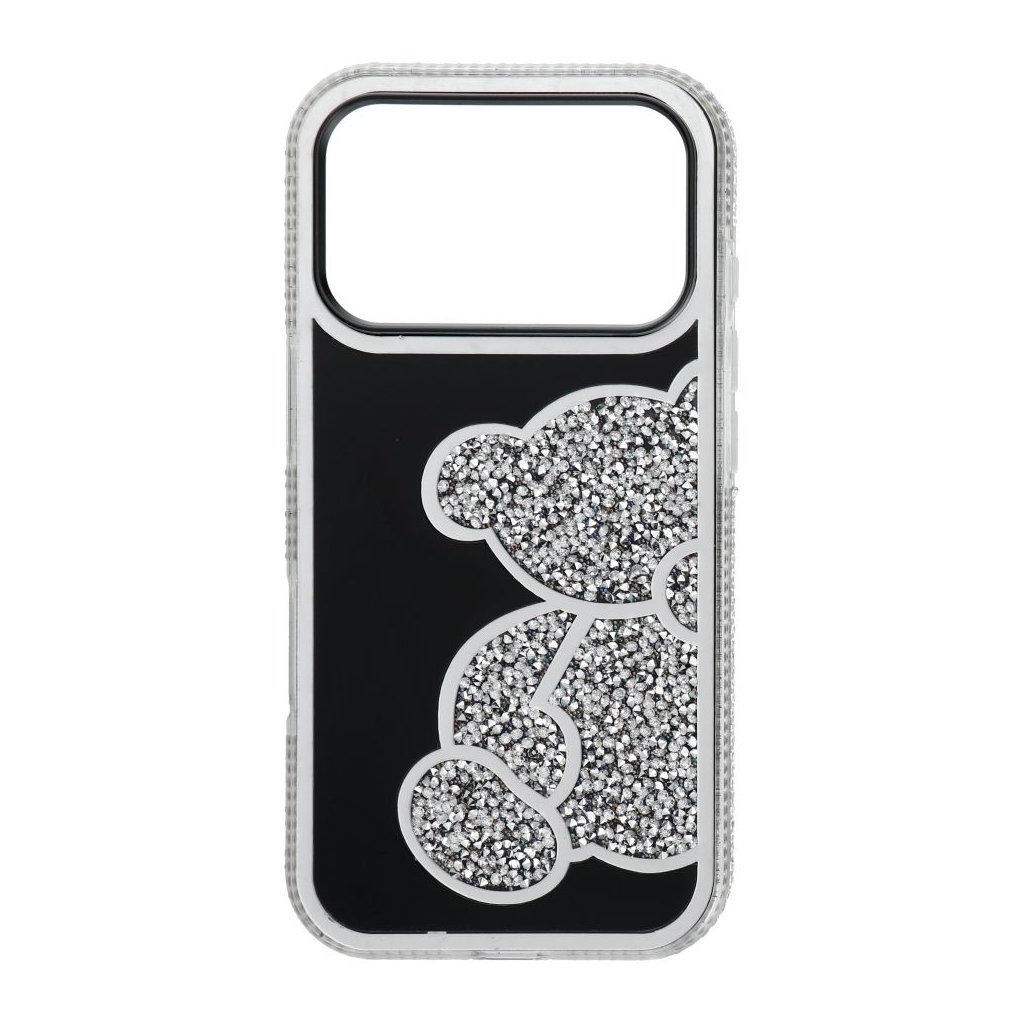 Elegantný kryt na mobil TEDDY BEAR pre IPHONE 17 Pro strieborný ktorý sa vyznačuje charakteristickým trblietavým vzorom medvedíka, vyvýšenými okrajmi a plastom.