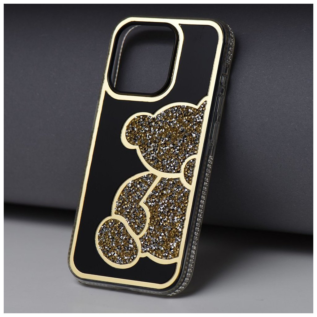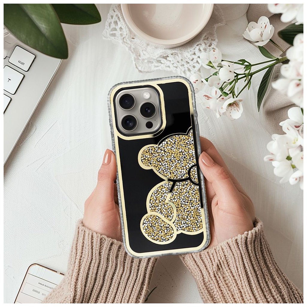 Elegantný kryt na mobil TEDDY BEAR pre IPHONE 17 zlatý ktorý sa vyznačuje charakteristickým trblietavým vzorom medvedíka, vyvýšenými okrajmi a plastom.