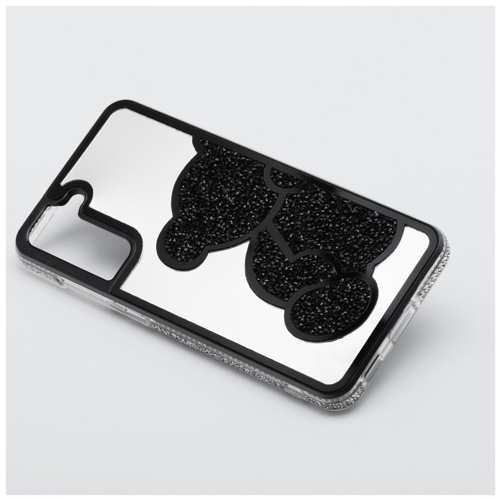Elegantný kryt na mobil TEDDY BEAR pre SAMSUNG A57 5G čierny ktorý sa vyznačuje charakteristickým trblietavým vzorom medvedíka, vyvýšenými okrajmi a plastom.
