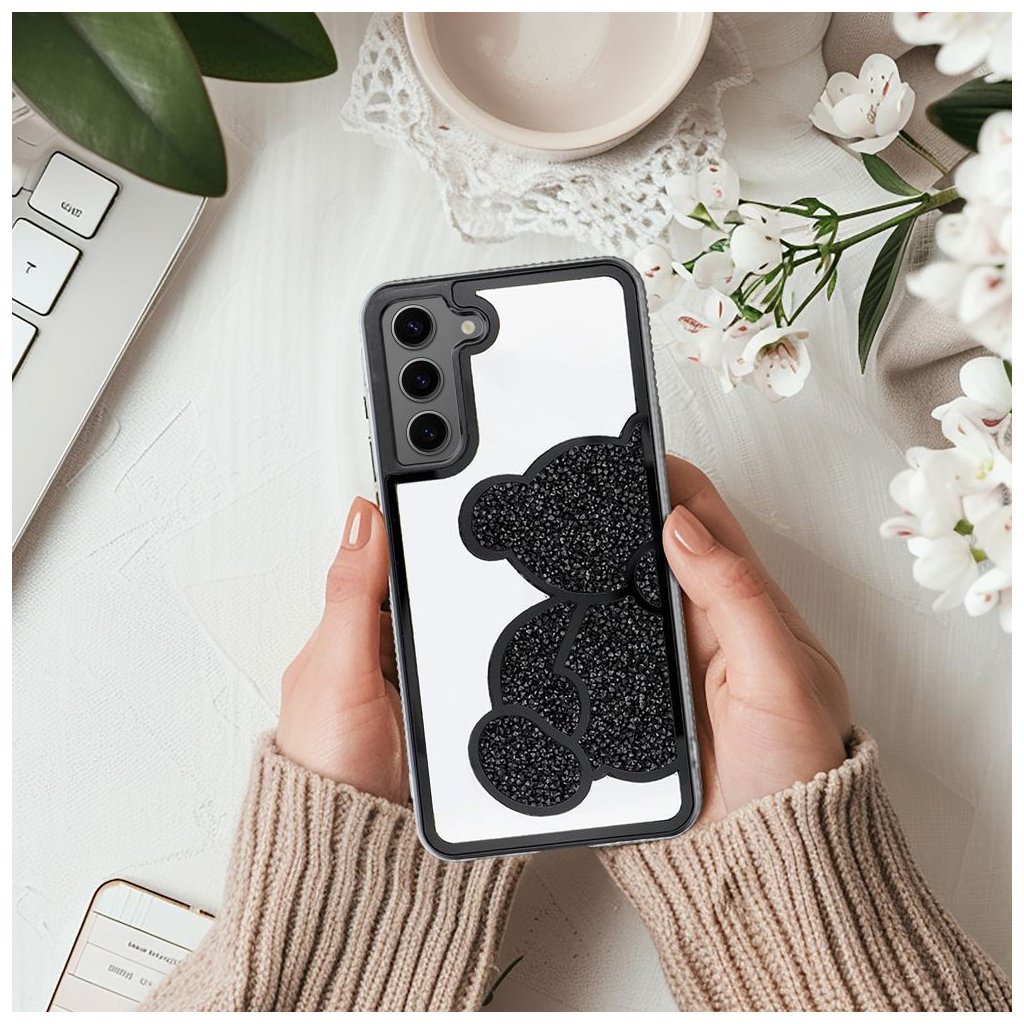 Elegantný kryt na mobil TEDDY BEAR pre SAMSUNG S25 Edge čierny ktorý sa vyznačuje charakteristickým trblietavým vzorom medvedíka, vyvýšenými okrajmi a plastom.