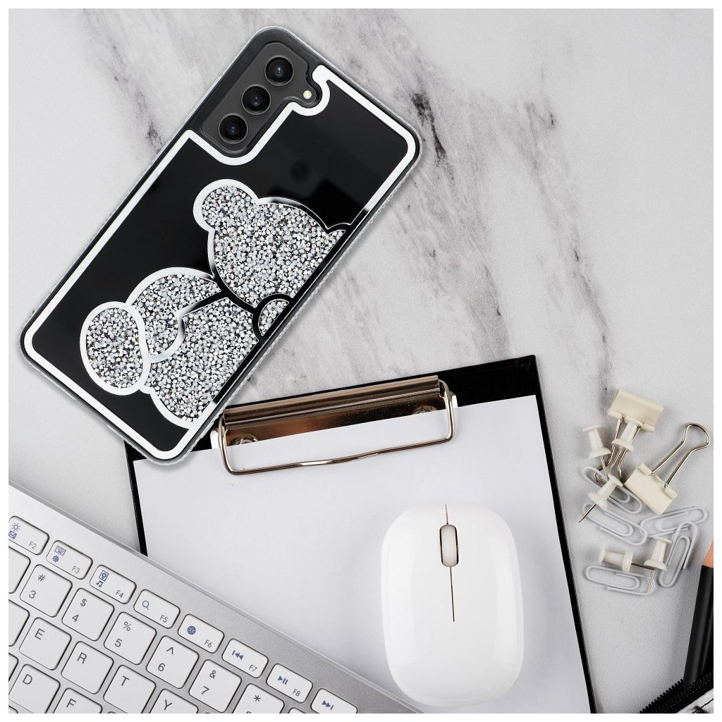 Elegantný kryt na mobil TEDDY BEAR pre SAMSUNG S25 Edge strieborný ktorý sa vyznačuje charakteristickým trblietavým vzorom medvedíka, vyvýšenými okrajmi a plastom.