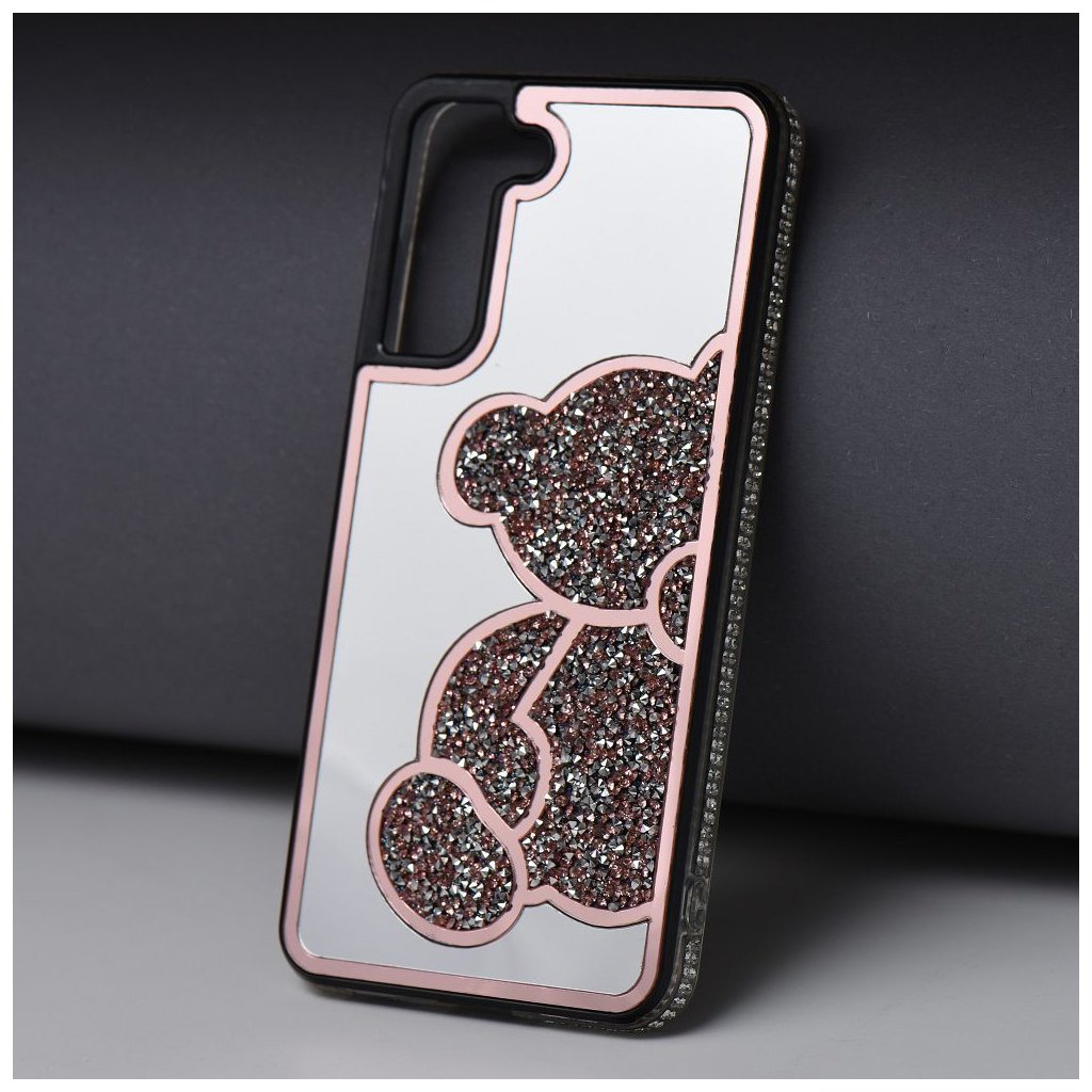 Elegantný kryt na mobil TEDDY BEAR pre SAMSUNG S25 FE ružový ktorý sa vyznačuje charakteristickým trblietavým vzorom medvedíka, vyvýšenými okrajmi a plastom.