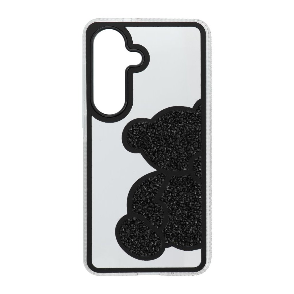 Elegantný kryt na mobil TEDDY BEAR pre SAMSUNG S26 čierny ktorý sa vyznačuje charakteristickým trblietavým vzorom medvedíka, vyvýšenými okrajmi a plastom.