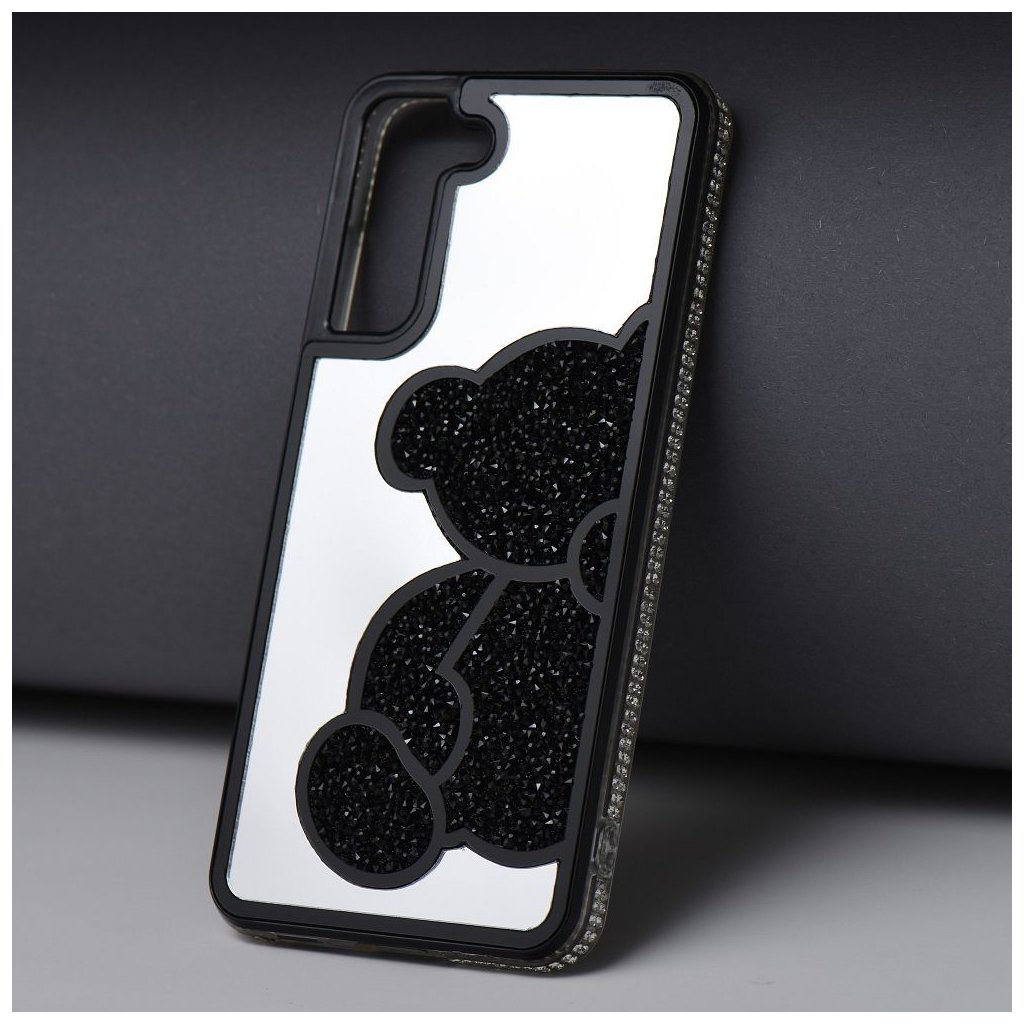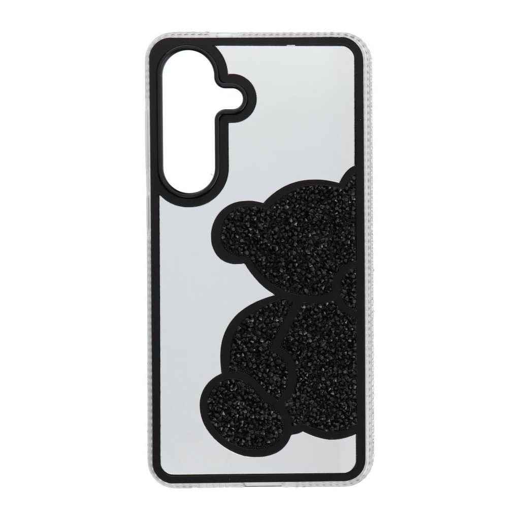 Elegantný kryt na mobil TEDDY BEAR pre SAMSUNG S26 Plus čierny ktorý sa vyznačuje charakteristickým trblietavým vzorom medvedíka, vyvýšenými okrajmi a plastom.