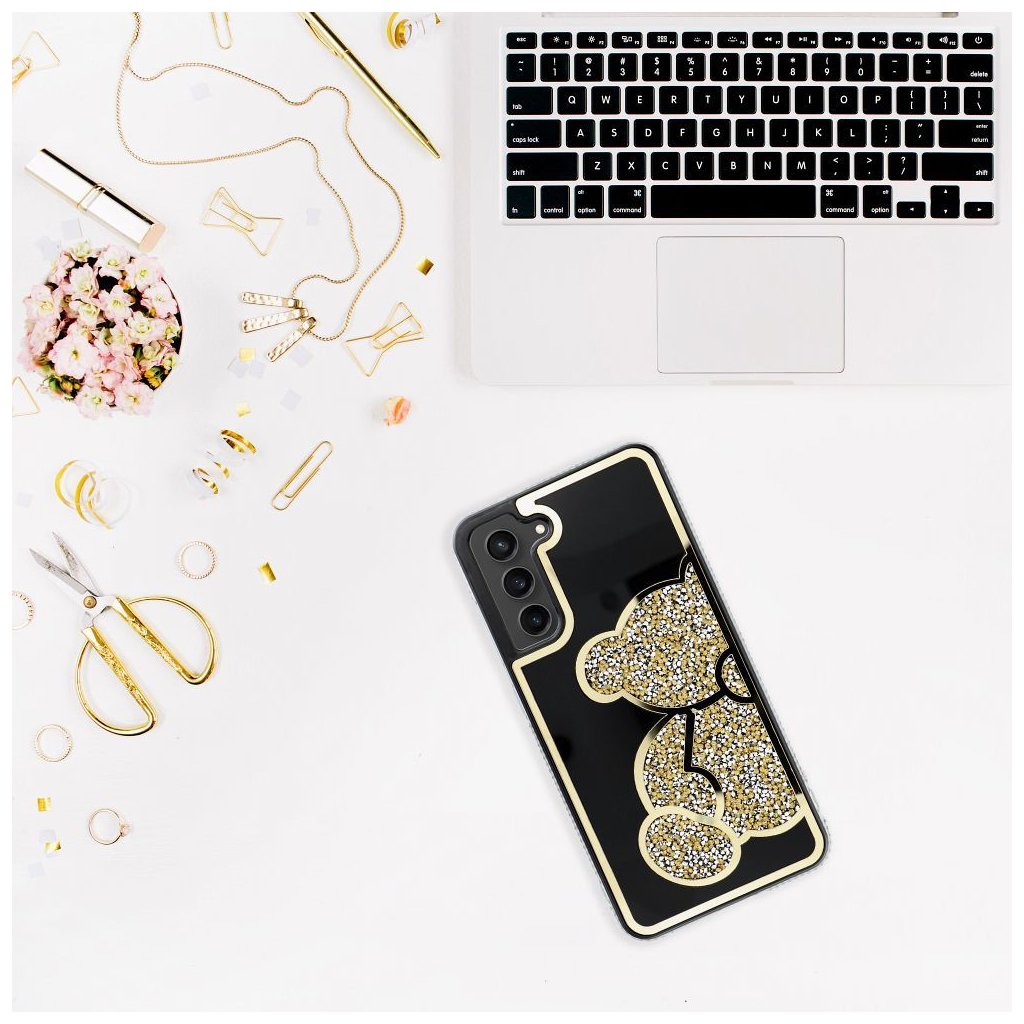Elegantný kryt na mobil TEDDY BEAR pre SAMSUNG S26 Plus zlatý ktorý sa vyznačuje charakteristickým trblietavým vzorom medvedíka, vyvýšenými okrajmi a plastom.