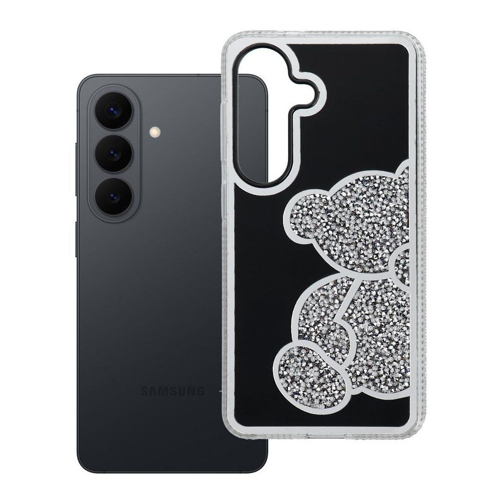 Elegantný kryt na mobil Case for Samsung S26 Teddy Bear strieborný ktorý sa vyznačuje charakteristickým trblietavým vzorom medvedíka, vyvýšenými okrajmi a plastom.