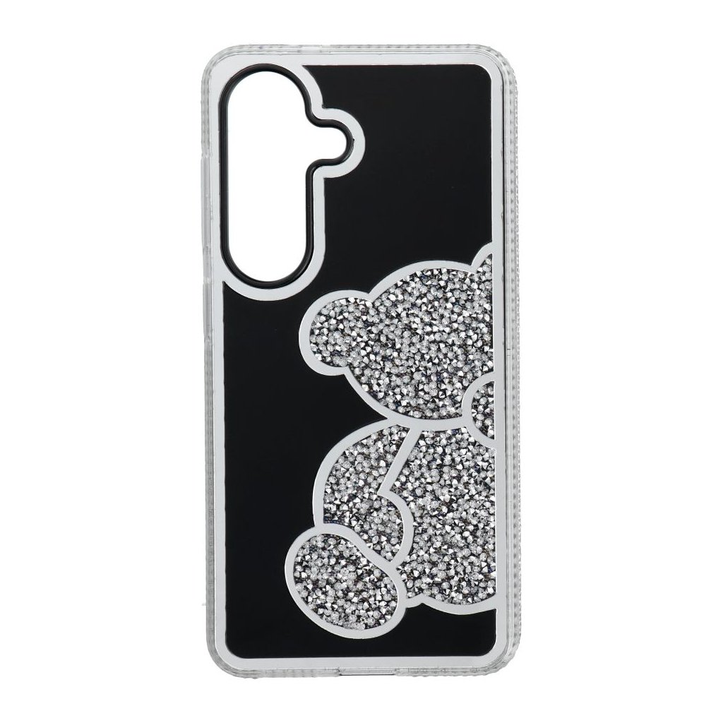 Elegantný kryt na mobil TEDDY BEAR pre SAMSUNG S26 strieborný ktorý sa vyznačuje charakteristickým trblietavým vzorom medvedíka, vyvýšenými okrajmi a plastom.