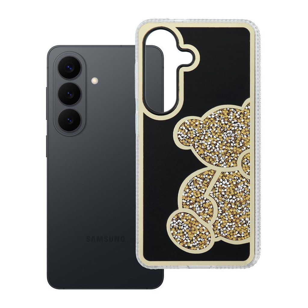 Elegantný kryt na mobil Case for Samsung S26 Teddy Bear zlatý ktorý sa vyznačuje charakteristickým trblietavým vzorom medvedíka, vyvýšenými okrajmi a plastom.