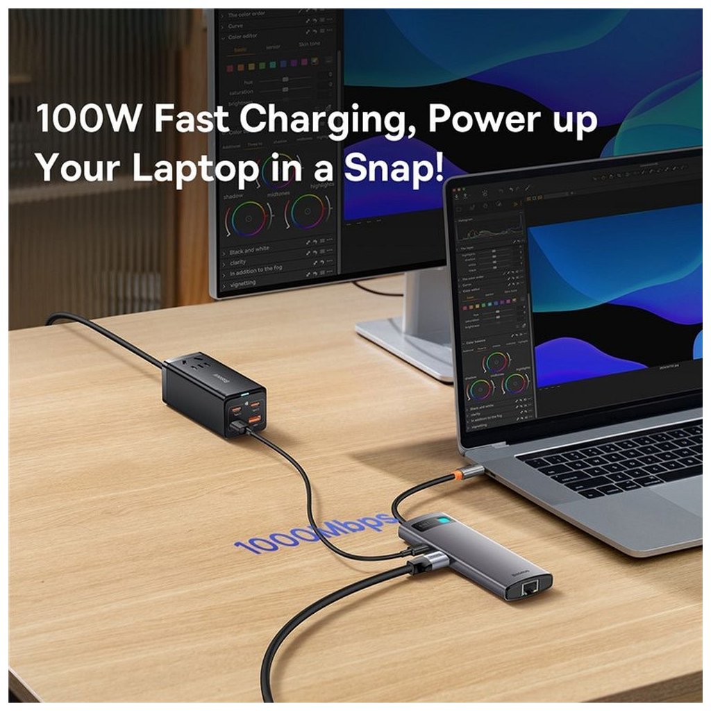 HUB umožňuje používať 5 portov v: 3x USB-A 3.0, 1x USB-C PD 100 W, 1x HDMI 4K 60 Hz a 1x RJ45 1Gb/s na káblové pripojenie k internetu