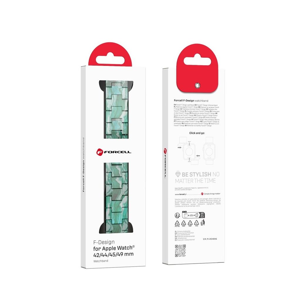 Remienok Forcell F-Design bol vytvorený s ohľadom na hodinky Apple Watch. Je vyrobený z vysokokvalitného plastu imitujúceho živicu. Mramorový vzor dodáva remienku eleganciu a jedinečný vzhľad, ktorý je ideálny na rôzne príležitosti. Vďaka univerzálnemu klasickému dizajnu sa dokonale hodí k rôznym štýlom.