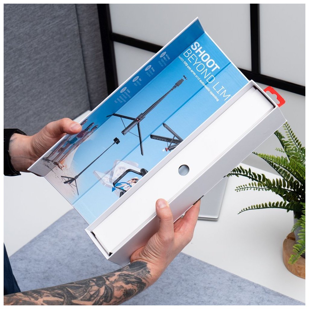 Ak chcete selfie tyč rozložiť na statív, jednoducho ju zdvihnite asi 10 cm nad povrch a uvoľnite – statív sa automaticky rozloží. Táto funkcia umožňuje rýchle a jednoduché nastavenie bez rizika poškodenia nechtov alebo iných problémov súvisiacich s manuálnym rozkladaním.