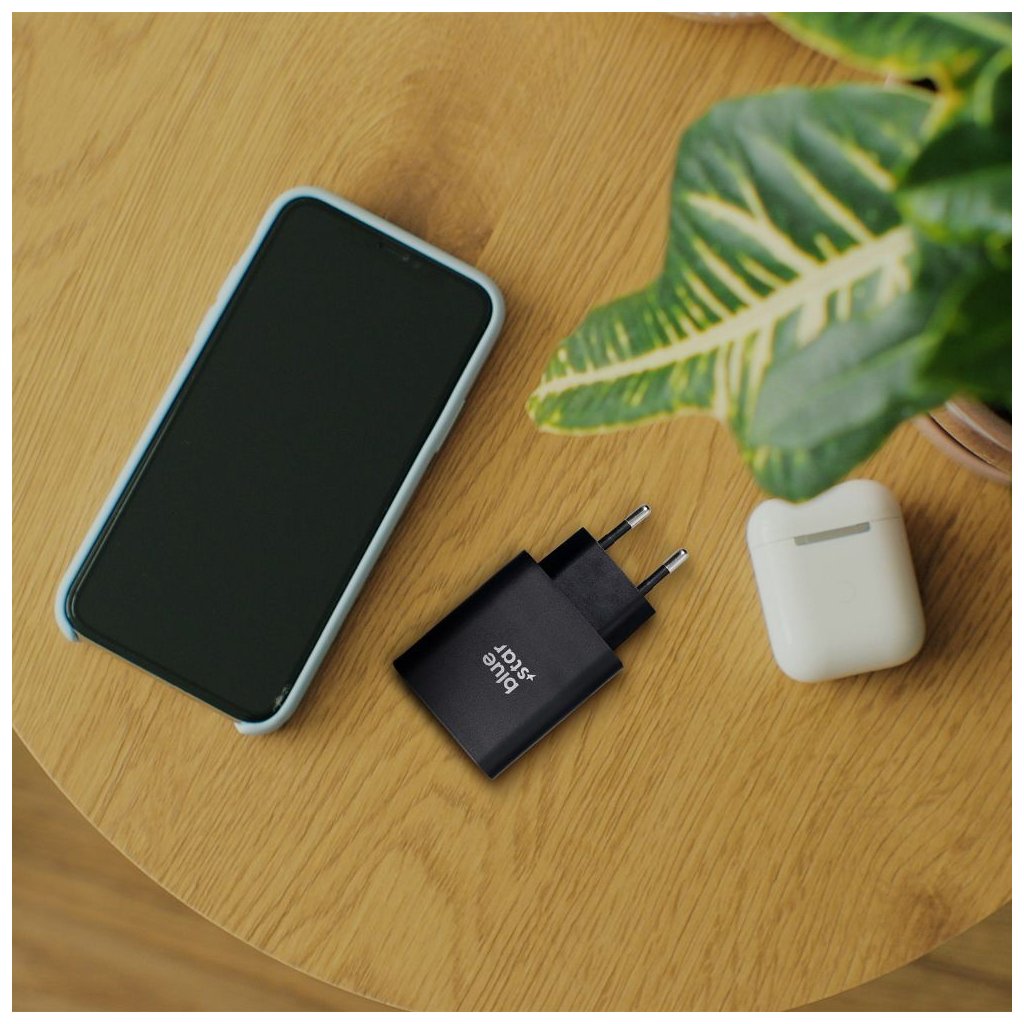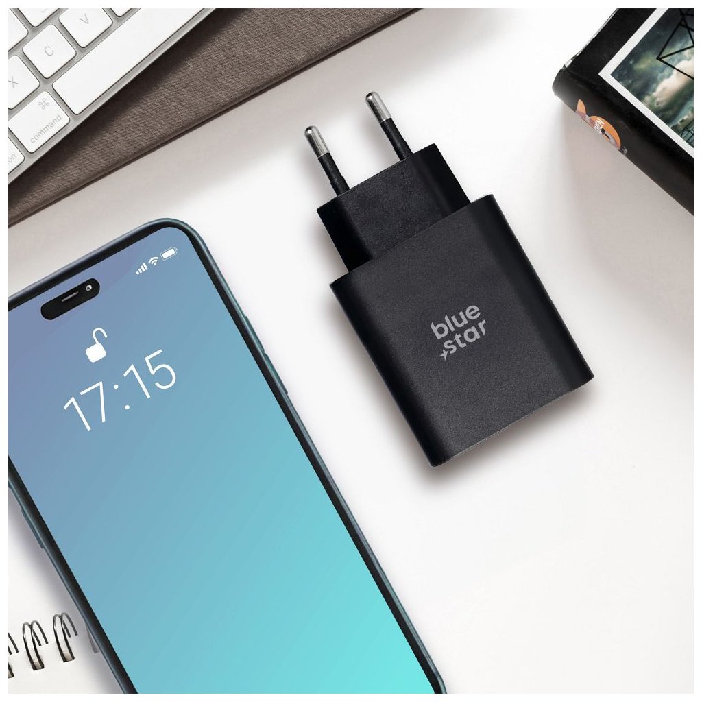Cestovná nabíjačka BLUE STAR so zásuvkami, USB C+USB-A PD QC4.0 3A 25W, čierna farba (TFB-TC-25WPD)
