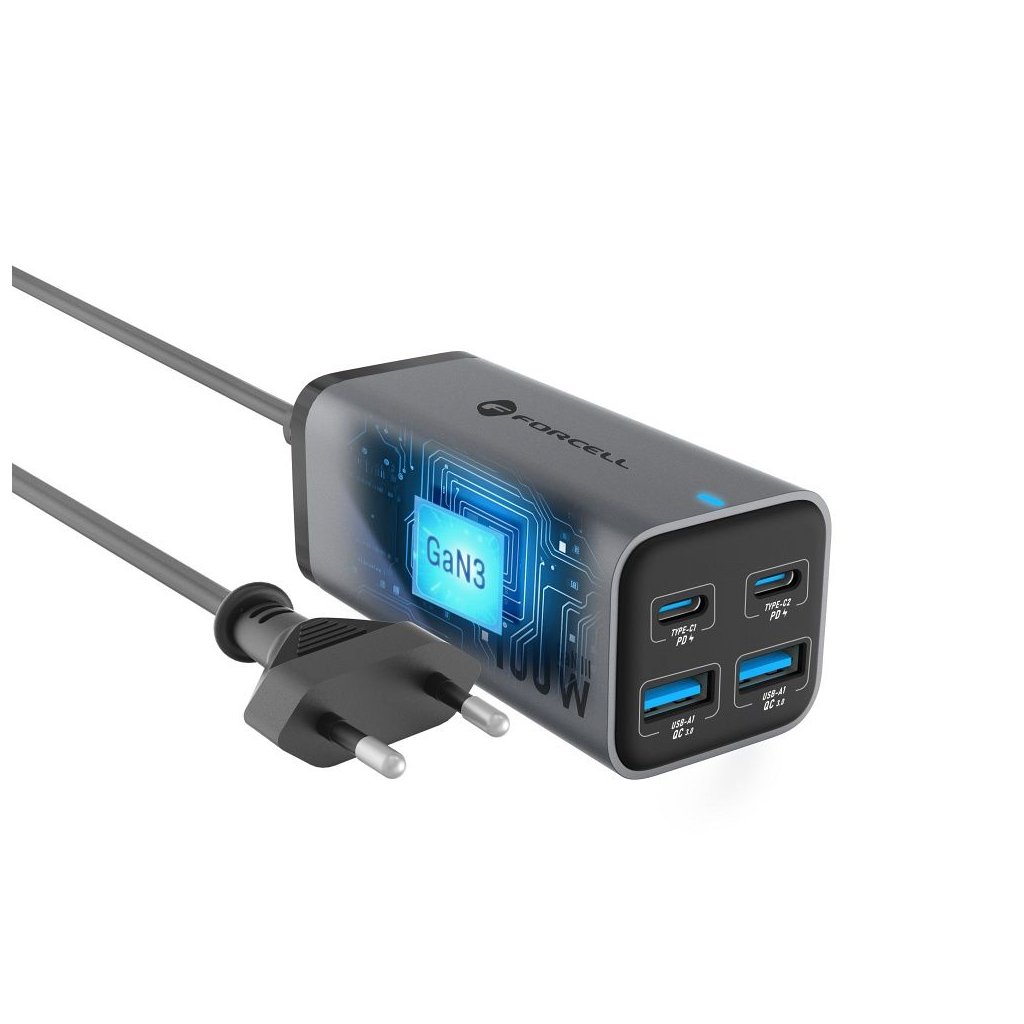 Stolová nabíjačka FORCELL F-ENERGY GaN III 2x USB-C + 2x USB-A PD QC4.0 SFC2.0 5A 100W sivá (VT-51)