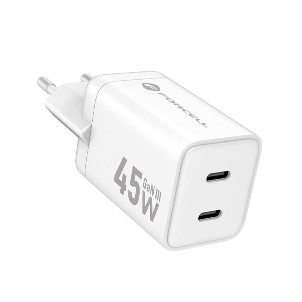 Nabíjačka Forcell Mini GaN III 45 W ponúka vysokú účinnosť v minimálnej veľkosti. Podporuje Power Delivery (PD), Quick Charge 4.0 a Super Fast Charging 2.0 pre rýchle nabíjanie smartfónov, tabletov a ďalších zariadení. Vďaka dvom portom USB-C dokáže napájať dve zariadenia súčasne.