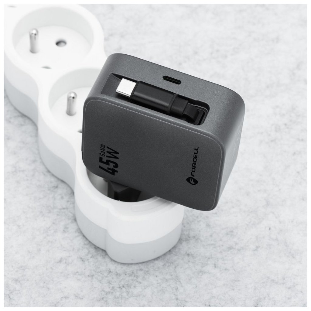 Cestovná nabíjačka FORCELL F-ENERGY GaN III VT-R5 s navíjacím káblom USB-C a nabíjacím portom typu C PD QC4.0 3A 45W sivá