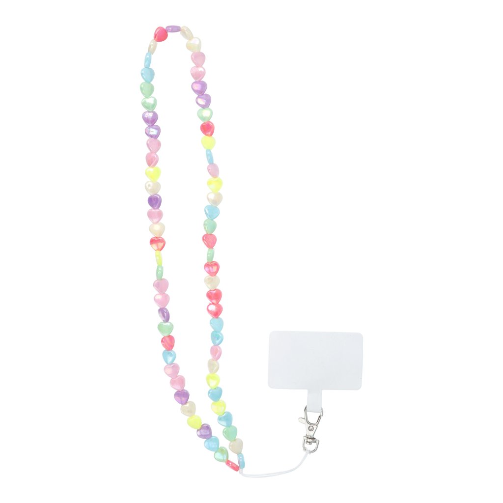 Korálkový prívesok telefónu. Vďaka dlhej šnúre, ktorú si zavesíte okolo krku, nemusíte odkladať svoje obľúbené zariadenie. Vzor s očarujúcimi srdiečkami sa dokonale hodí k letným, farebným štylizáciám.