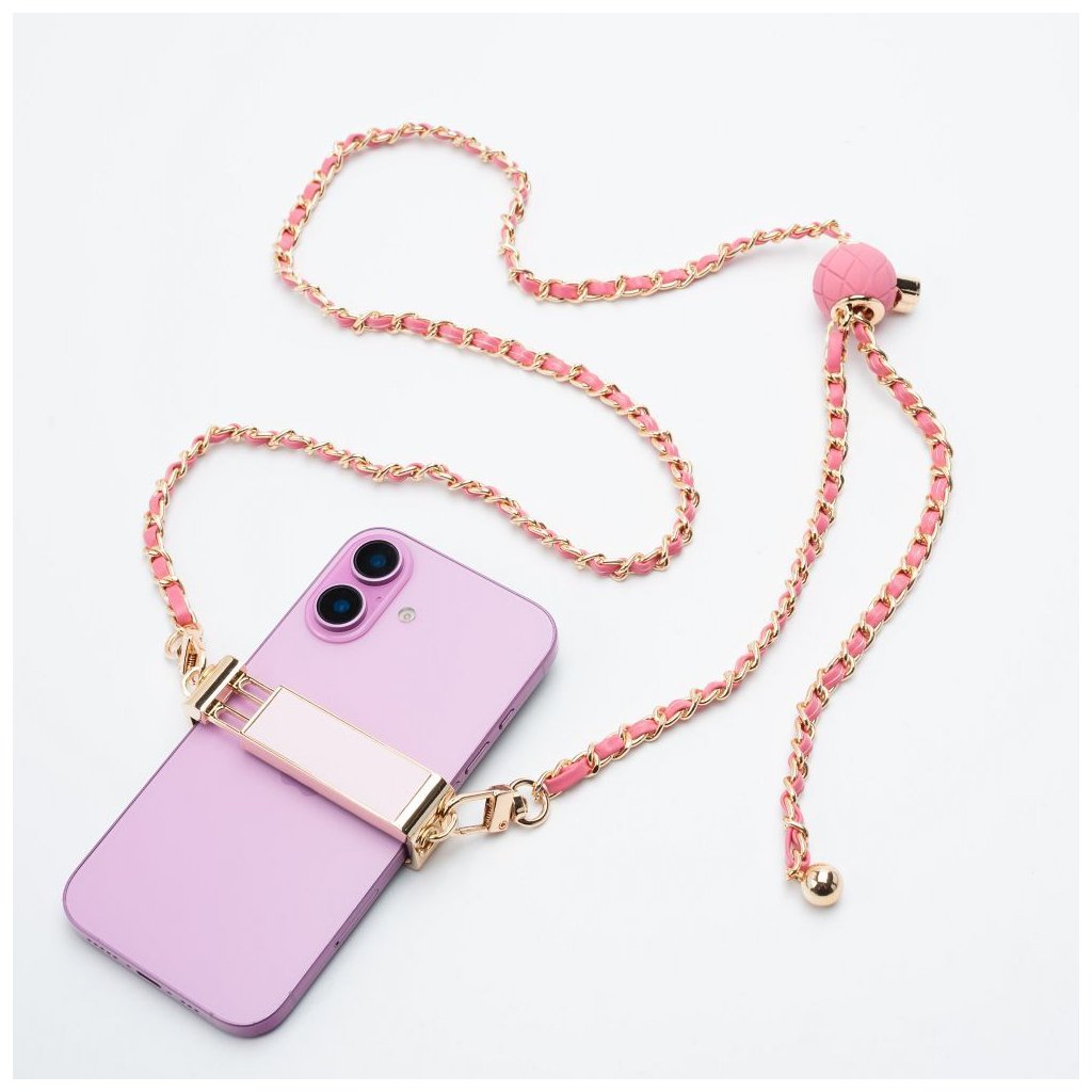 Vyrobený z kovovej retiazky a pletenej PU kože, produkt je moderným doplnkom každého telefónu. Zlaté povrchové úpravy a ozdobná nastavovacia guľôčka mu dodávajú elegantný charakter. Dĺžku šnúrky je možné nastaviť podľa potrieb používateľa – na nosenie cez rameno alebo okolo krku.