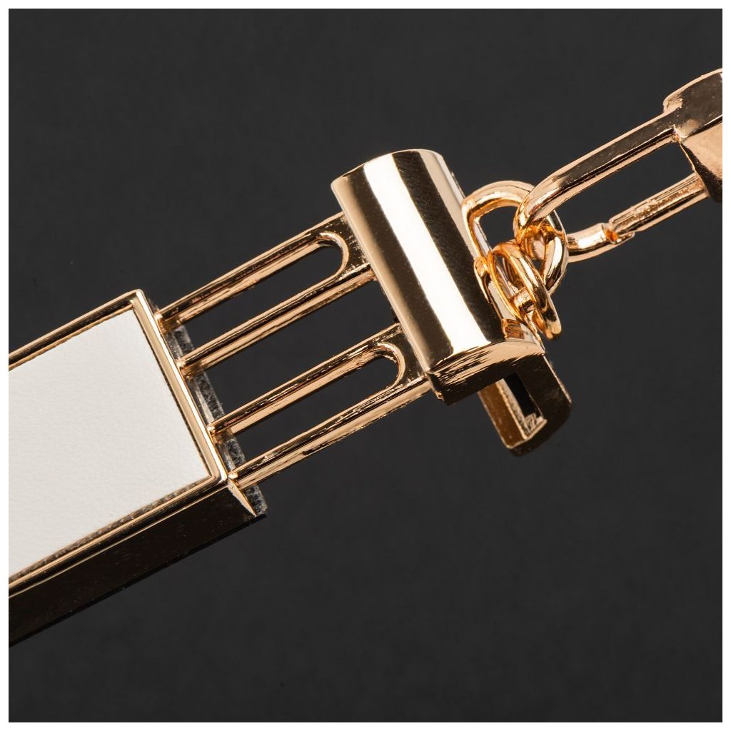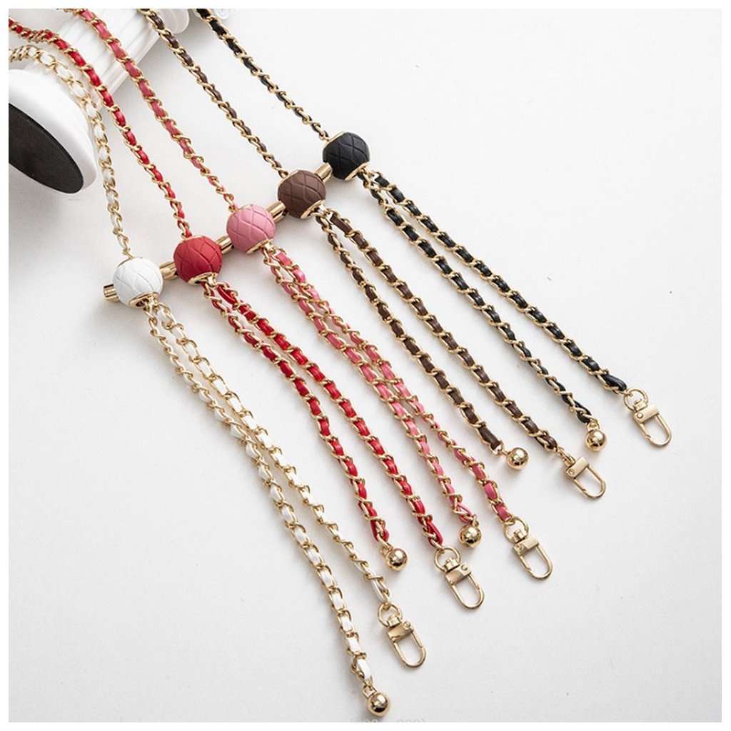 Vyrobený z kovovej retiazky a pletenej PU kože, produkt je moderným doplnkom každého telefónu. Zlaté povrchové úpravy a ozdobná nastavovacia guľôčka mu dodávajú elegantný charakter. Dĺžku šnúrky je možné nastaviť podľa potrieb používateľa – na nosenie cez rameno alebo okolo krku.