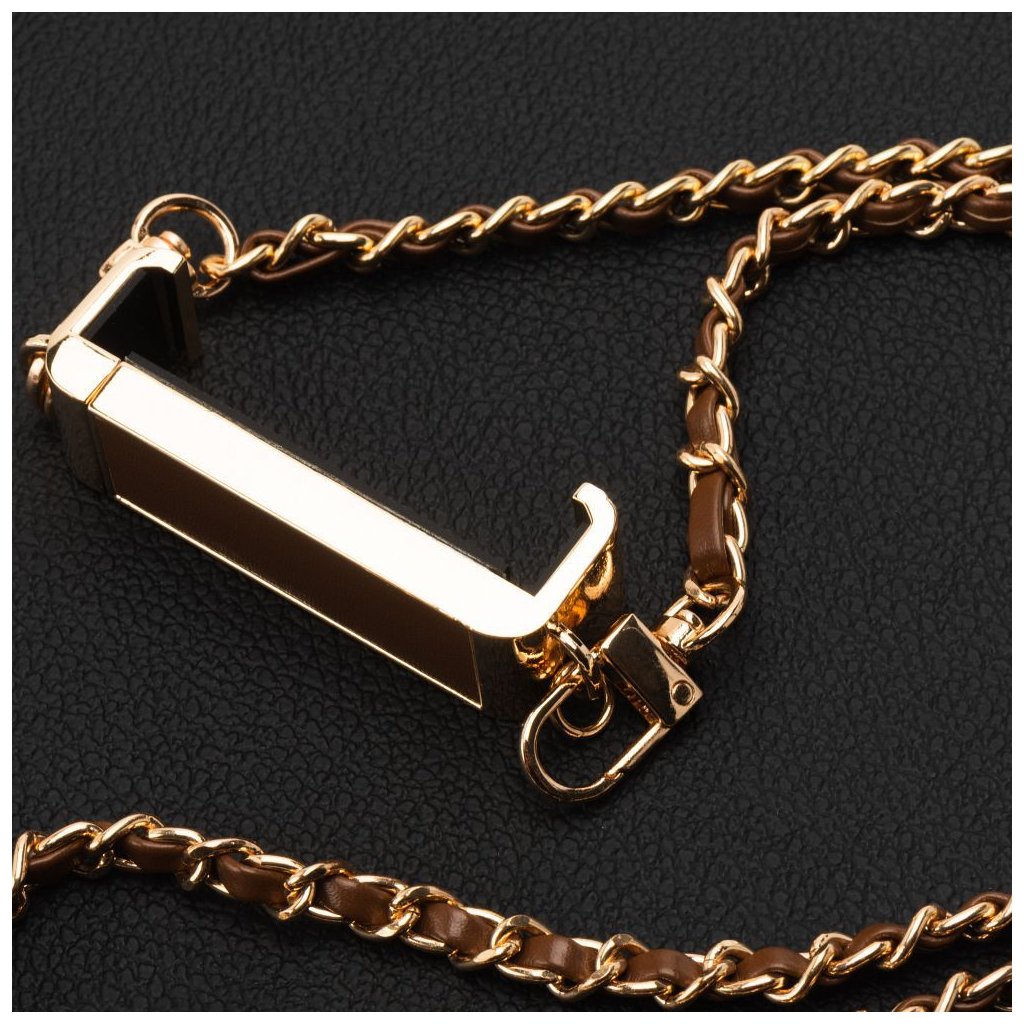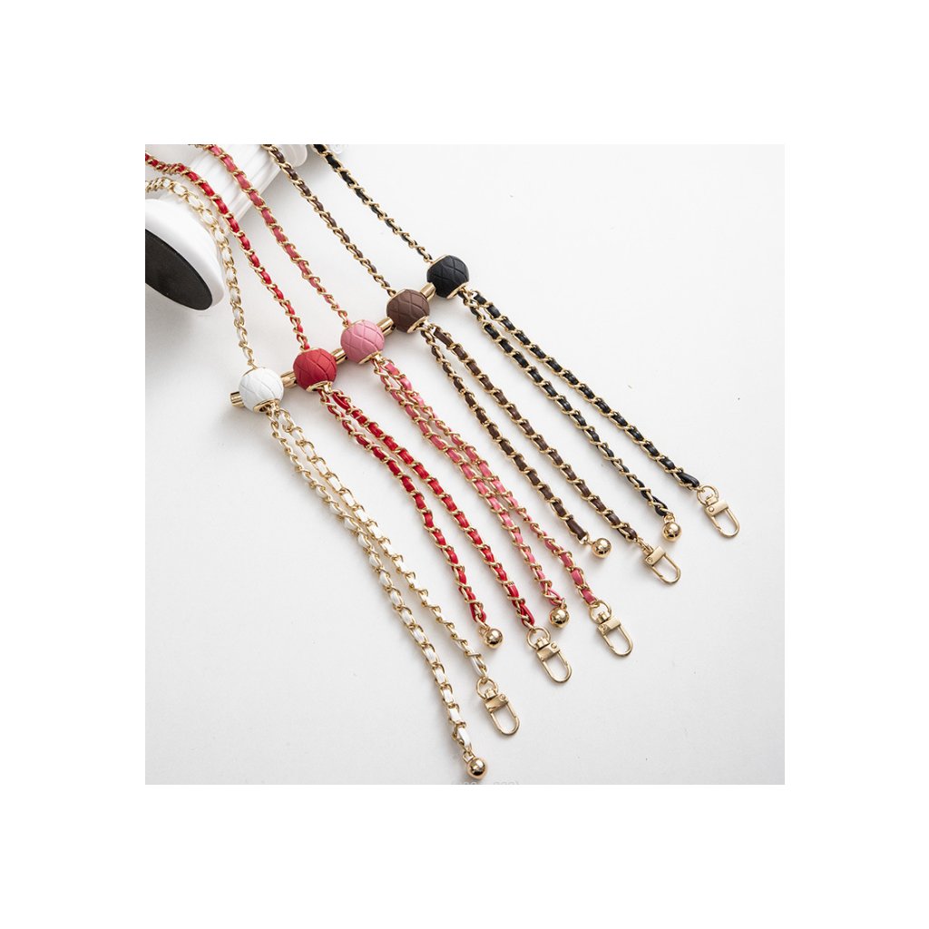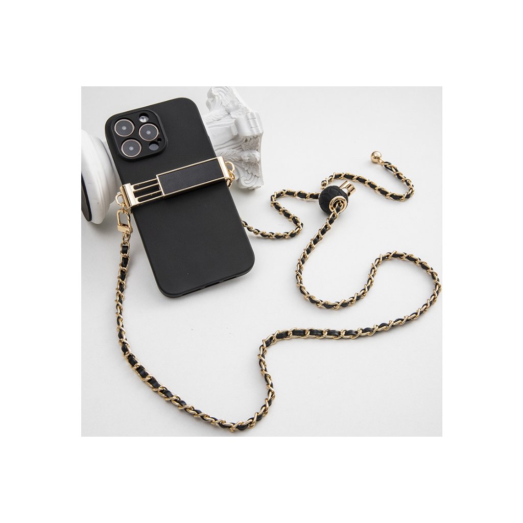 Vyrobený z kovovej retiazky a pletenej PU kože, produkt je moderným doplnkom každého telefónu. Zlaté povrchové úpravy a ozdobná nastavovacia guľôčka mu dodávajú elegantný charakter. Dĺžku šnúrky je možné nastaviť podľa potrieb používateľa – na nosenie cez rameno alebo okolo krku.