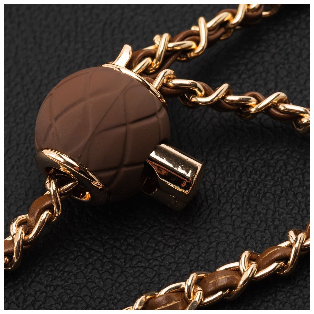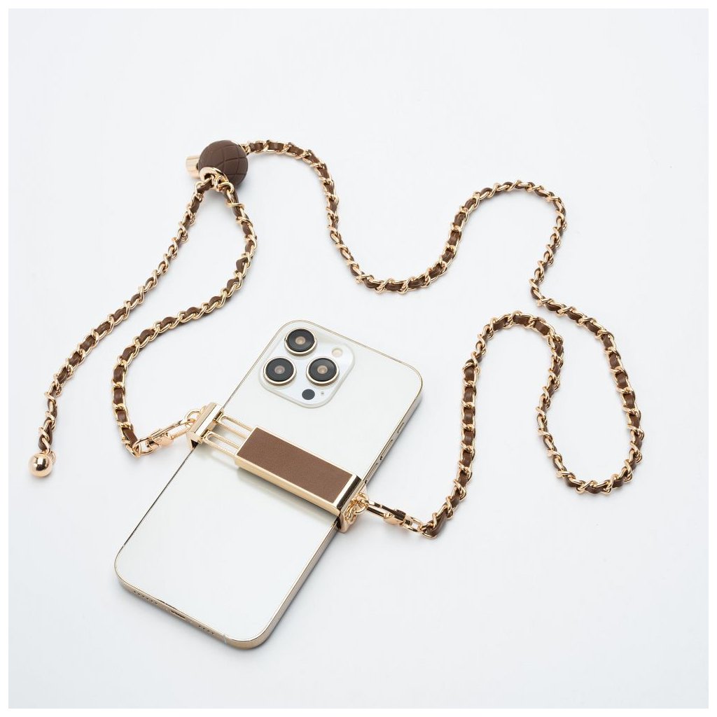 Vyrobený z kovovej retiazky a pletenej PU kože, produkt je moderným doplnkom každého telefónu. Zlaté povrchové úpravy a ozdobná nastavovacia guľôčka mu dodávajú elegantný charakter. Dĺžku šnúrky je možné nastaviť podľa potrieb používateľa – na nosenie cez rameno alebo okolo krku.
