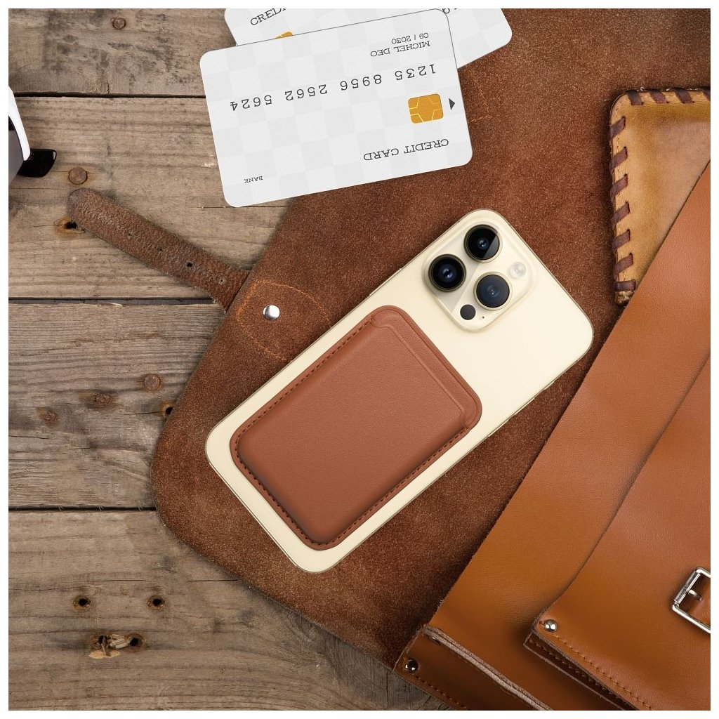 Magnetická peňaženka pre smartfóny iPhone série 12/13/14, ktoré podporujú technológiu MagSafe®. Je vyrobená z ekologickej kože, vyzerá elegantne a mimoriadne silný magnet zabraňuje náhodnému odpojeniu od zariadenia. Peňaženka umožňuje uchovávať potrebné doklady, napr. platobné karty, dokumenty alebo vstupenky.