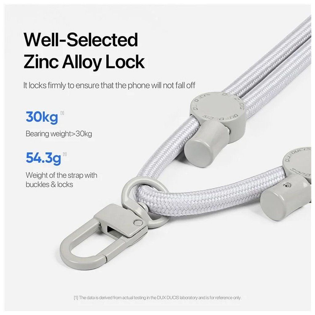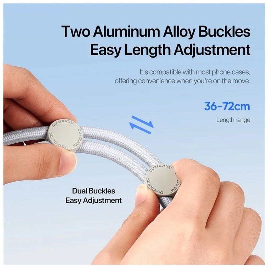 Šnúrka DUX DUCIS Plaz ponúka jednoduché nastavenie dĺžky od 36 do 72 cm, vďaka čomu je vhodná pre ľudí rôznej výšky a s rôznymi preferenciami štýlu nosenia. To robí šnúrku extrémne univerzálnou a poskytuje pohodlie pri každodennom používaní, ako pri prechádzkach, tak aj pri fyzických aktivitách. Dve pracky z hliníkovej zliatiny zaručujú pevné uchytenie a bezpečnosť telefónu.