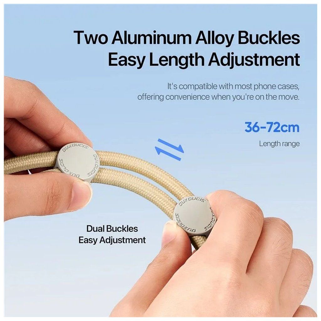 Šnúrka DUX DUCIS Plaz ponúka jednoduché nastavenie dĺžky od 36 do 72 cm, vďaka čomu je vhodná pre ľudí rôznej výšky a s rôznymi preferenciami štýlu nosenia. To robí šnúrku extrémne univerzálnou a poskytuje pohodlie pri každodennom používaní, ako pri prechádzkach, tak aj pri fyzických aktivitách. Dve pracky z hliníkovej zliatiny zaručujú pevné uchytenie a bezpečnosť telefónu.