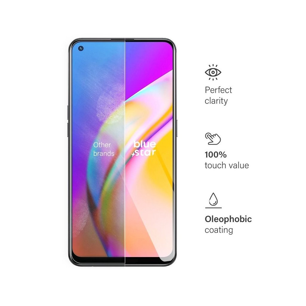 Ochranné tvrdené sklo Blue Star pre Oppo A94 zaistí Vášmu telefónu efektívnu ochranu, vynikajúcu čistotu obrazu a zamaskuje škrabance na displeji. Vďaka oleofóbnemu poťahu sa nemusíte báť odtlačkov prstov a zachytávania mastnôt.